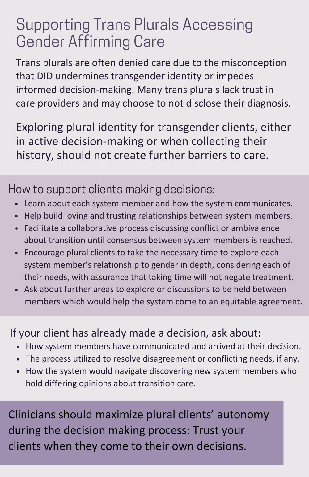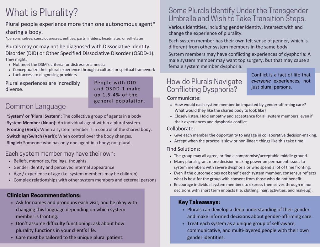For clients who may or may not be diagnosed with Dissociative Identity Disorder (DID), and identify as transgender:What are the intersections of trans and plural experience?How can we support autonomous decision-making and access to gender affirming care?