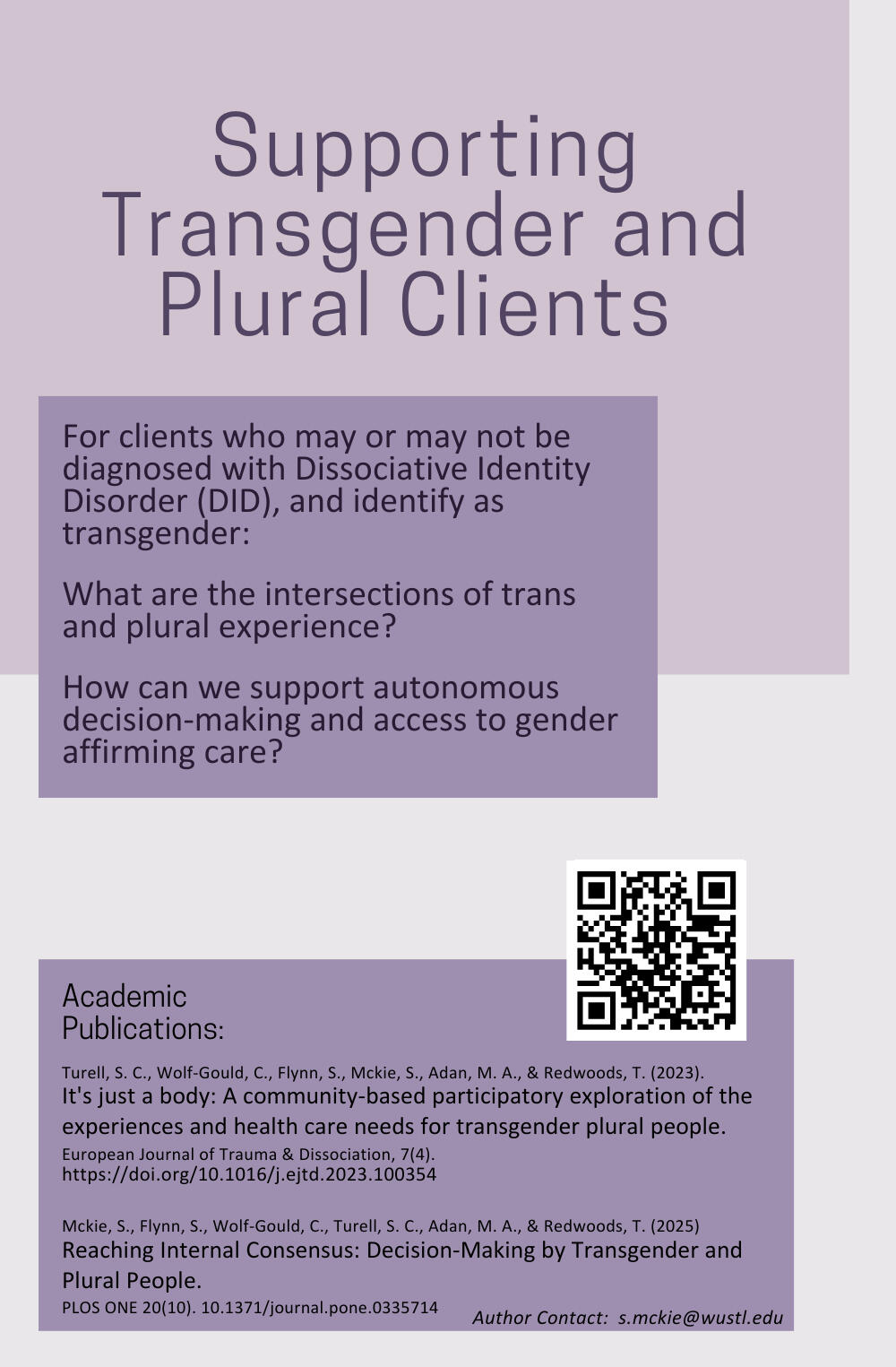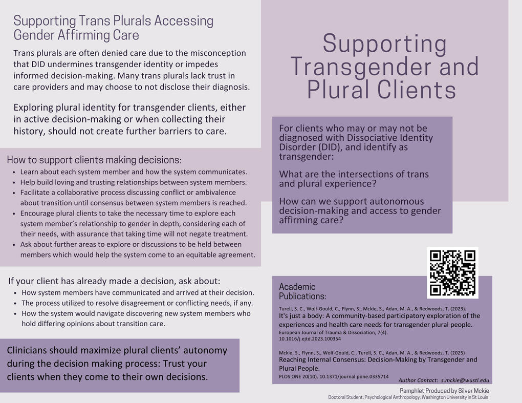 Turell, S. C., Wolf-Gould, C., Flynn, S., Mckie, S., Adan, M. A., & Redwoods, T. (2023). It's just a body: A community-based participatory exploration of the experiences and health care needs for transgender plural people. European Journal of Trauma & Dissociation, 7(4). https://doi.org/10.1016/j.ejtd.2023.100354Mckie, S., Flynn, S., Wolf-Gould, C., Turell, S. C., Adan, M. A., & Redwoods, T. (2025) Reaching Internal Consensus: Decision-Making by Transgender and Plural People. PLOS ONE 20(10): e0335714. https://doi.org/10.1371/journal.pone.0335714
